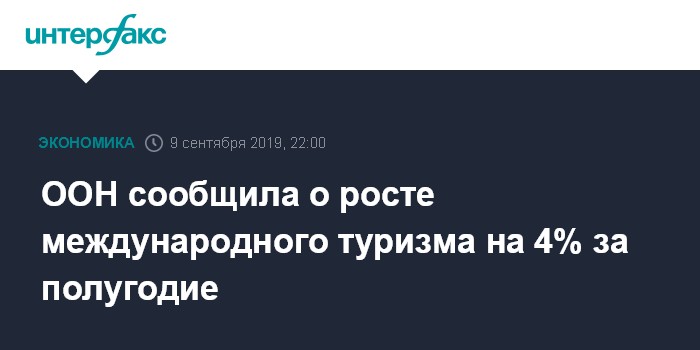 Москва. 9 сентября. INTERFAX.RU - В I полугодии 2019 года число международных туристических поездок в мире выросло на 4% до 671 миллиона, сообщила Всемирная туристская организация ООН (UNWTO). Это на 30 млн больше, чем за такой же период 2018 года.