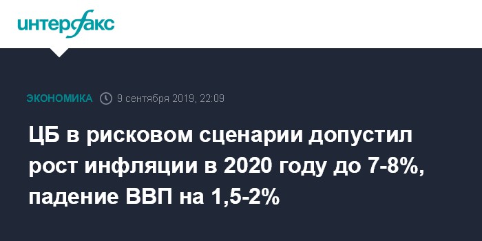 Москва. 9 сентября. INTERFAX.RU - Банк России уточнил параметры рискового сценария, допустив рост инфляции в 2020 году до 7-8% с 4-4,5% в 2019 году и падение ВВП РФ в 2020 году на 1,5-2,0% после роста на 0,8-1,3% в 2019 году. Об этом говорится в проекте основных направлений единой государственной денежно-кредитной политики на 2020-2022 годы.