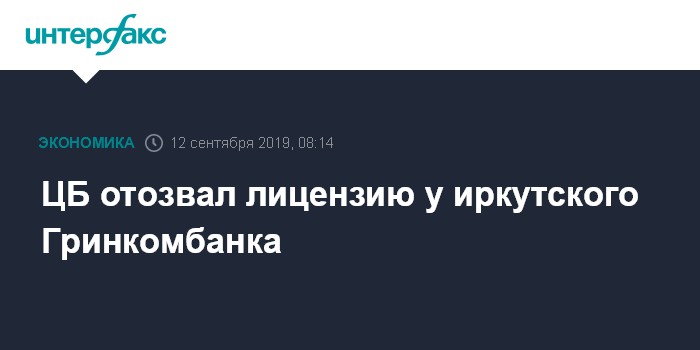 Москва. 12 сентября. INTERFAX.RU - Банк России с 12 сентября отозвал лицензию у иркутского Гринкомбанка. По величине активов кредитная организация занимала 410-е место в банковской системы страны.