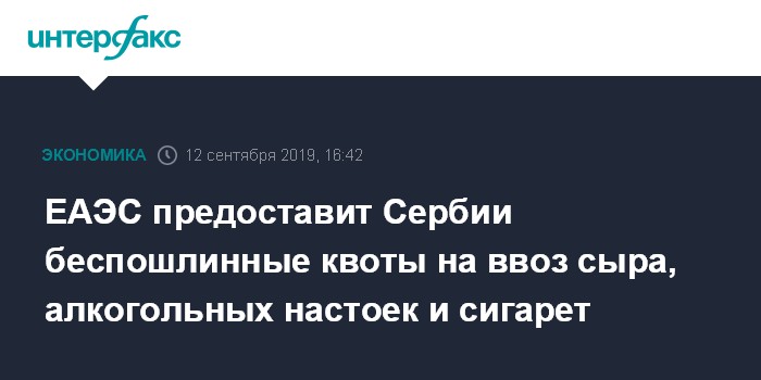Москва. 12 сентября. INTERFAX.RU - ЕАЭС предоставит Сербии беспошлинные квоты на ввоз некоторых видов твёрдых и полутвёрдый сыров, алкогольных настоек и сигарет.