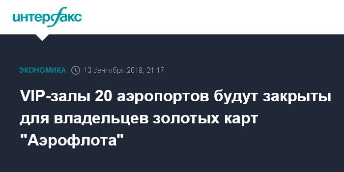 Москва. 13 сентября. INTERFAX.RU - "Аэрофлот" с 15 сентября закроет бесплатный доступ в VIP-залы аэропортов 18 городов владельцам "золотых" бонусных карт, сообщила пресс-служба авиакомпании. С 13 августа такое же решение было принято для аэропортов Архангельска и Магнитогорска.