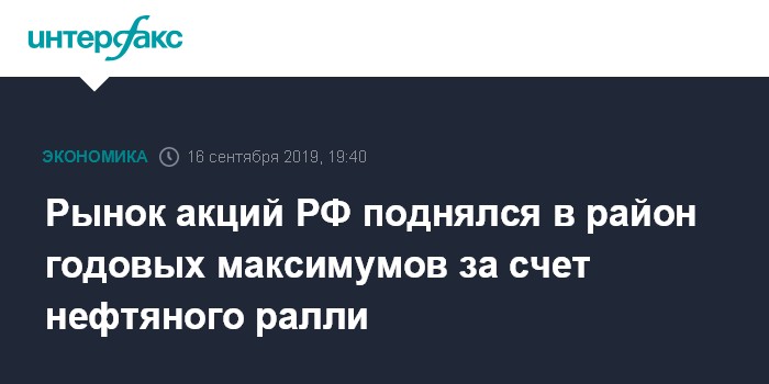 Москва. 16 сентября. INTERFAX.RU - Рынок акций РФ в понедельник, 16 сентября, поднялся в район годовых максимумов индексов за счет раллирующей нефти из-за двукратного падения добычи сырья в Саудовской Аравии после атак дронов на объекты нефтяной промышленности страны. Лидерами роста ожидаемо выступили акции нефтяных компаний, причем оборот по бумагам "Татнефти" достиг исторического максимума.