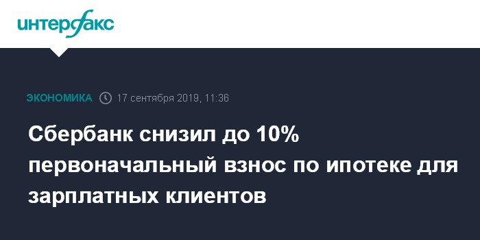 Москва. 17 сентября. INTERFAX.RU - Сбербанк с 17 сентября снизил для своих зарплатных клиентов минимальный первоначальный взнос по ипотеке с 15% до 10%, сообщила пресс-служба банка.