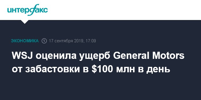 Москва. 17 сентября. INTERFAX.RU - Забастовка рабочих, которые добиваются льгот и повышения зарплат, может стоить автопроизводителю General Motors до $100 млн в день, подсчитали аналитики, опрошенные The Wall Street Journal. Последствия от забастовки для экономики США будут не столь значительными, как в 90-х годах, поскольку численность профсоюзов с тех пор сократилась, отмечает издание.