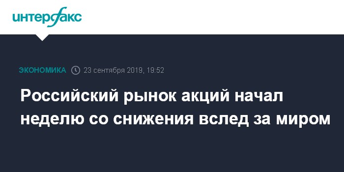 Москва. 23 сентября. INTERFAX.RU - Российский рынок акций начал неделю с умеренного снижения вслед за мировыми площадками и на фоне слабой нефти, откат индексов сдерживался подросшими бумагами "Норникеля" на фоне роста цен на металлы.