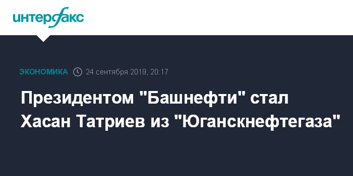 Москва. 24 сентября. INTERFAX.RU - Совет директоров "Башнефти" (входит в "Роснефть") назначил новым президентом и председателем правления компании Хасана Татриева, возглавлявшего ранее ООО "РН-Юганскнефтегаз", сообщает пресс-служба "Роснефти" .