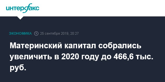 Москва. 25 сентября. INTERFAX.RU - Проект федерального бюджета на 2020 год и плановый период 2021-2022 годов предусматривает увеличение размера материнского капитала в 2020 году на 3,8% до 466,6 тысячи рублей. Текст документа размещен вечером в среду на портале проектов правовых актов для общественного обсуждения.
