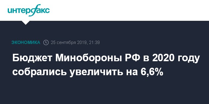 Москва. 25 сентября. INTERFAX.RU - Расходы Министерства обороны России на будущий год вырастут на 6,6%, следует из проекта федерального бюджета на 2020-2022 годы.