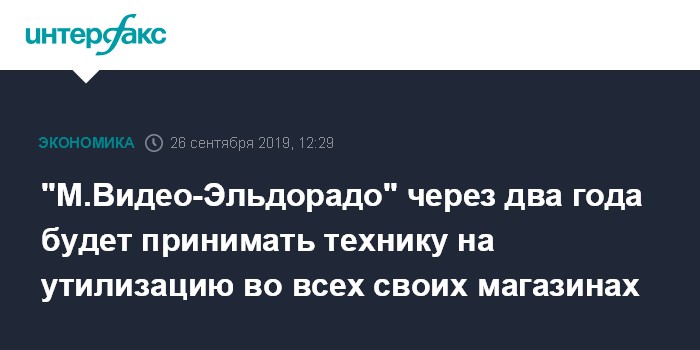 Москва. 26 сентября. INTERFAX.RU - Ритейлер "М.Видео-Эльдорадо" начал принимать бытовую технику и электронику на утилизацию более чем в 200 магазинах в Москве и Подмосковье. В течение двух лет он рассчитывает запустить прием техники на утилизацию во всех 220 городах, где есть магазины сети.