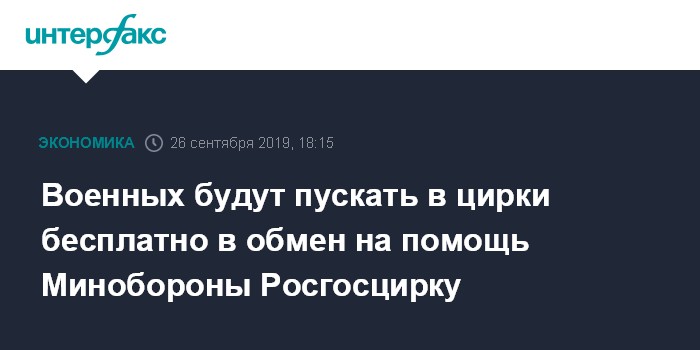 Москва. 26 сентября. INTERFAX.RU - Росгосцирк разрешит военным ходить в цирк бесплатно в обмен на помощь Минобороны в восстановлении досуговых центров в регионах. Об этом сообщил гендиректор Росгосцирка Владимир Шемякин. Такая договоренность с Минобороны прорабатывается.