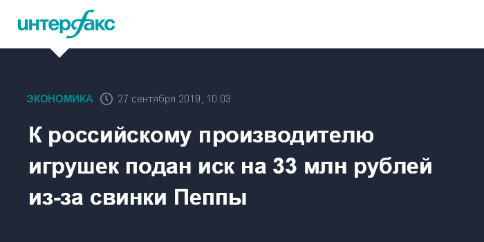 Москва. 27 сентября. INTERFAX.RU - Британская Entertainment One UK, которой принадлежат права на свинку Пеппу, подала иск на 32,9 млн рублей к одному из крупнейших российских производителей игрушек, компании "Симбат". Третьей стороной в иске назван "Яндекс.Маркет", пишет "Коммерсантъ".