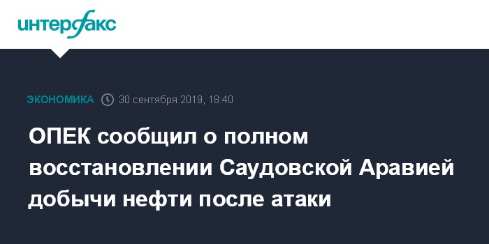 Москва. 30 сентября. INTERFAX.RU - Саудовская Аравия добилась полного восстановления добычи нефти после инцидента с атакой на объекты ТЭК страны, сообщил генеральный секретарь ОПЕК Мохаммед Баркиндо на пресс-конференции по итогам заседания Валдайского клуба.