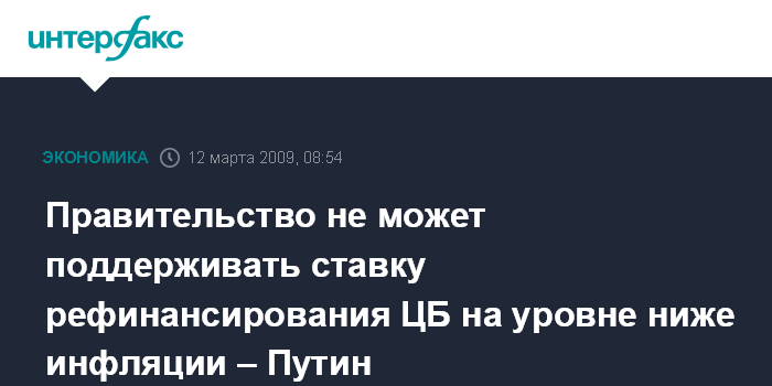 Москва. 12 марта. INTERFAX.RU - Правительство не может поддерживать ставку рефинансирования ЦБ ниже уровня инфляции, заявил премьер-министр РФ Владимир Путин на встрече с шахтерами в Новокузнецке в четверг.