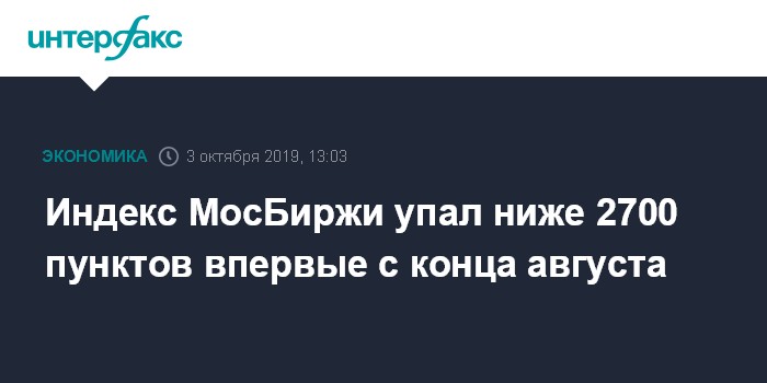 Москва. 3 октября. INTERFAX.RU - Индекс МосБиржи, один из основных российских фондовых индикаторов, днем в четверг откатился ниже рубежа 2700 пунктов впервые с конца августа на фоне негативной динамики мировых площадок из-за опасений замедления экономики США.