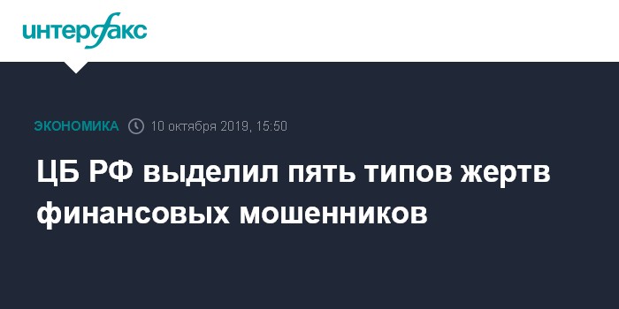 Москва. 10 октября. INTERFAX.RU - ЦБ РФ совместно с представителями служб информационной безопасности банков и психологами выделил пять основных типов жертв мошенников в финансовой сфере, говорится в обзоре Центра мониторинга и реагирования на компьютерные атаки в кредитно-финансовой сфере (ФинЦЕРТа) департамента информационной безопасности Банка России.
