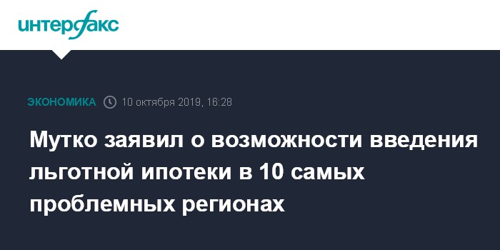 Москва. 10 октября. INTERFAX.RU - Программы предоставления льготной ипотеки могут ввести в 10 регионах РФ с наиболее низким уровнем социально-экономического развития, заявил журналистам вице-премьер РФ Виталий Мутко.