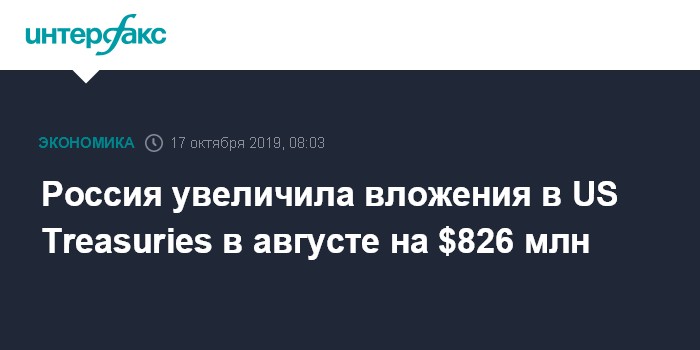 Москва. 17 октября. INTERFAX.RU - Россия увеличила вложения в казначейские обязательства Минфина США (US Treasuries) в августе 2019 года на $826 млн по сравнению с июлем.