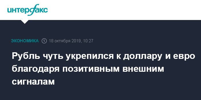 По мнению экспертов "Интерфакс-ЦЭА", плавное укрепление рубля к доллару и евро на старте торгов пятницы связано прежде всего с позитивными сигналами, поступающими с мировых рынков капитала, в том числе с нефтяных площадок, благодаря оптимизму инвесторов по поводу новой сделки по Brexit. Премьер-министр Великобритании Борис Джонсон и председатель Еврокомиссии Жан-Клод Юнкер объявили в четверг, 17 октября, что Лондон и Брюссель достигли соглашения по условиям Brexit - и потому нет смысла думать об очередном переносе крайнего срока выхода Британии из ЕС. Джонсон призвал членов британской Палаты общин сплотиться, одобрить соглашение по Brexit и начать выстраивать новые отношения с ЕС.