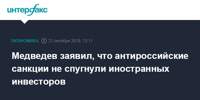 Москва. 21 октября. INTERFAX.RU - Санкции в отношении России не сказались на интересе иностранных инвесторов к ее рынку, заявил премьер-министр РФ Дмитрий Медведев.