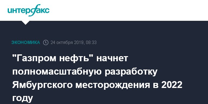 Москва. 24 октября. INTERFAX.RU - "Газпром нефть" планирует начать полномасштабную промышленную разработку Ямбургского месторождения в 2022 году, сообщил журналистам глава компании Александр Дюков.