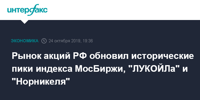 Москва. 24 октября. INTERFAX.RU - Рынок акций РФ в четверг обновил исторические максимумы индекса МосБиржи на фоне подъема мировых площадок и нефти на ожиданиях торговой сделки США-КНР, вероятной отсрочки Brexit и смягчения монетарной политики мировыми центробанками; обновили свои вершины бумаги "ЛУКОЙЛа" и "Норникеля", а раллировавшие вторые торги подряд в отсутствие новостей акции "Сургутнефтегаза" стали лидерами подъема.