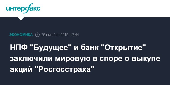НПФ "Будущее" и банк "Открытие" заключили мировую в споре о выкупе акций "Росгосстраха"