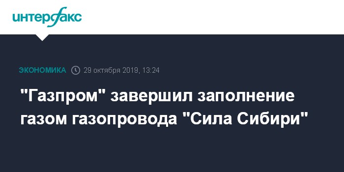 Москва. 29 октября. INTERFAX.RU - "Газпром" полностью завершил заполнение газом экспортного газопровода в Китай "Сила Сибири", сообщает управление информации российского концерна.