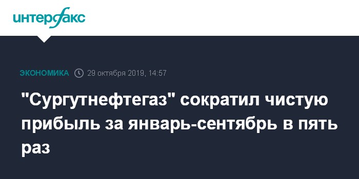 Москва. 29 октября. INTERFAX.RU - "Сургутнефтегаз" сократил чистую прибыль за девять месяцев по РСБУ в пять раз в годовом измерении, показатель составил 115,8 млрд рублей, говорится в отчете компании.