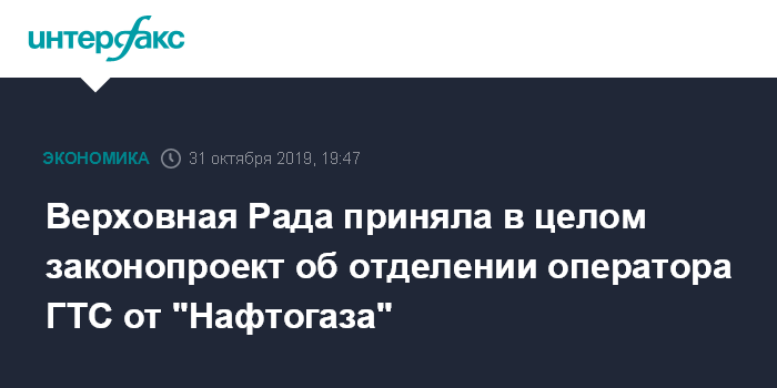 Москва. 31 октября. INTERFAX.RU - Верховная Рада приняла во втором чтении и в целом законопроект №2239-1, необходимый для отделения от НАК "Нафтогаз Украины" деятельности по транспортировке природного газа, сертификации нового независимого оператора газотранспортной системы (ГТС) и создания условий для заключения транзитного контракта с "Газпромом" по европейским правилам.