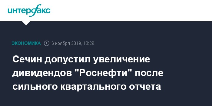 Москва. 6 ноября. INTERFAX.RU - С учетом сильных финансовых результатов "Роснефти" в III квартале акционеры могут рассчитывать на увеличение дивидендов за 2019 год, заявил главный исполнительный директор компании Игорь Сечин. Его слова приведены в пресс-релизе.