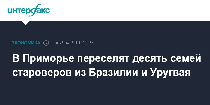 Москва. 7 ноября. INTERFAX.RU - В 2020 году в Приморье переедут десять семей староверов, которые пока живут в Бразилии, Боливии и Уругвая, сообщила пресс-служба краевой администрации. Они собираются развивать в регионе сельское хозяйство и возделывать необработанные земли.