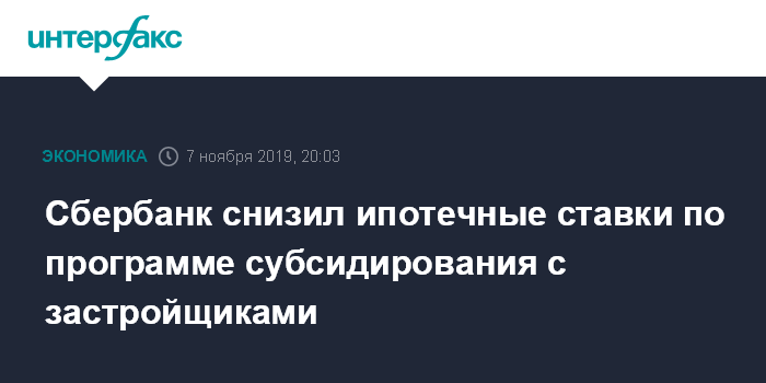 Москва. 7 ноября. INTERFAX.RU - Сбербанк сообщает о снижении ставки по ипотечным кредитам на покупку квартир в новостройках в рамках программы субсидирования с застройщиками.