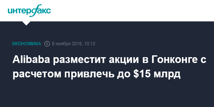 Ранее в этом году СМИ сообщали, что Alibaba, являющаяся крупнейшей по рыночной стоимости компанией Азии, подавала документы на получение листинга в Гонконге, но затем отказалась от планов размещения акций из-за проходящих там протестов.