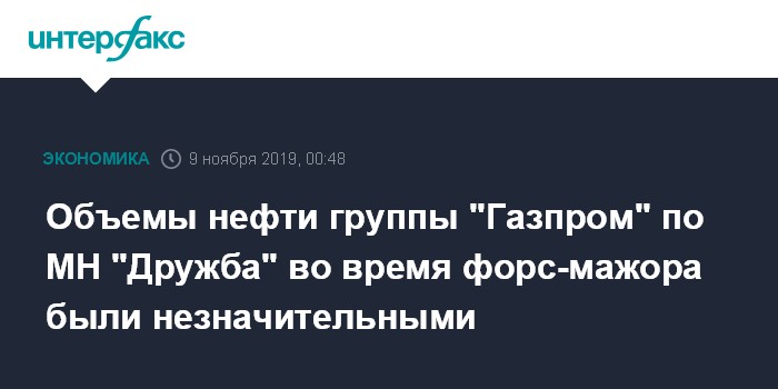 Москва. 9 ноября. INTERFAX.RU - Объемы нефти группы "Газпром" , транспортировавшиеся по нефтепроводу "Дружба" во время форс-мажора, были незначительными, говорится в меморандуме концерна к новому выпуску евробондов.