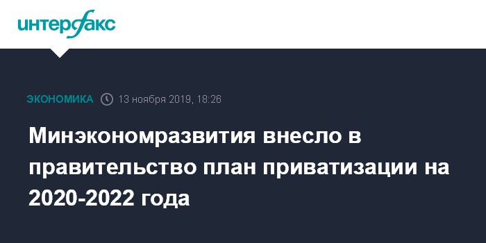 Москва. 13 ноября. INTERFAX.RU - Минэкономразвития РФ внесло в правительство план приватизации на 2020-2022 года, сообщила "Интерфаксу" замминистра экономического развития Оксана Тарасенко, курирующая в ведомстве тему приватизации.