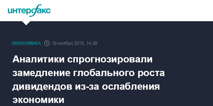 Москва. 18 ноября. INTERFAX.RU - В 2020 году рост глобального объема дивидендных выплат, вероятно, замедлится, так как ослабление темпов роста экономики в большей части стран мира отрицательно скажется на прибыли компаний. Это пишет Financial Times со ссылкой на обзор Janus Henderson Global Dividend Index (JHGDI).