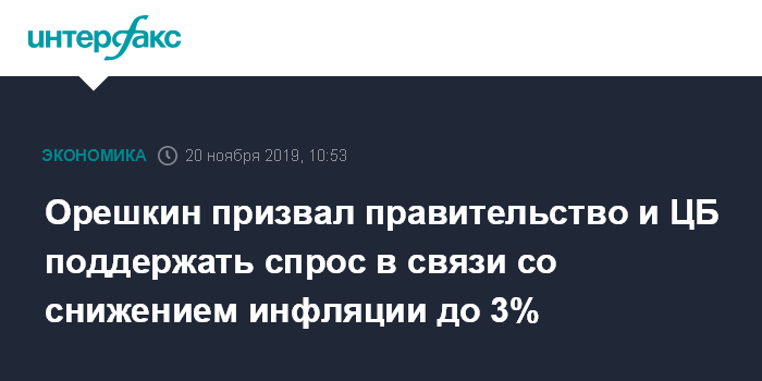 По словам Орешкина, ЦБ на эту проблему начал реагировать. Он призвал правительство скоординировать свои действия с ЦБ в этом отношении, чтобы совокупный спрос соответствовал инфляции в 4%, и инфляция стабильно держалась около целевого уровня.