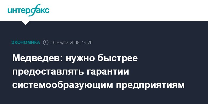 На встрече с первым вице-премьером РФ Игорем Шуваловым в понедельник Медведев напомнил, что решение об использовании механизма госгарантий для поддержки таких предприятий было принято еще в октябре прошлого года, в декабре вышло и соответствующее решение правительства.