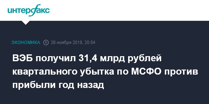 Москва. 28 ноября. INTERFAX.RU - В III квартале 2019 года ВЭБ получил 31,4 млрд рублей чистого убытка по МСФО против прибыли в размере 6 млрд рублей годом ранее. Это говорится в отчете госкорпорации.
