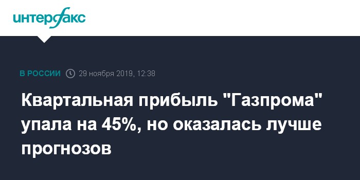 Москва. 29 ноября. INTERFAX.RU - В III квартале 2019 года чистая прибыль "Газпрома" по МСФО снизилась на 45% в годовом измерении и составила 211,789 млрд рублей. Опрошенные "Интерфаксом" аналитики прогнозировали, что показатель будет на уровне 194 млрд рублей.