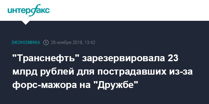 Москва. 29 ноября. INTERFAX.RU - "Транснефть" зарезервировала 23 млрд рублей на возмещение убытков грузоотправителям из-за загрязнения нефти в труброводе "Дружба" в апреле 2019 года. Об этом говорится в отчетности компании по МСФО.