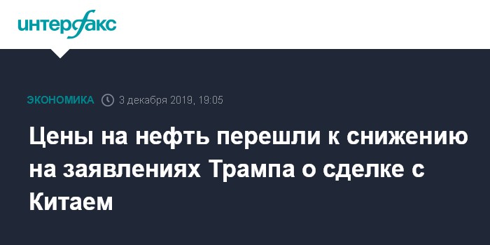 Москва. 3 декабря. INTERFAX.RU - Цены на нефть перешли к снижению на торгах во вторник на опасениях затягивания на неопределенный срок торгового спора США и Китая из-за заявлений президента Штатов Дональда Трампа.