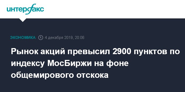 Москва. 4 декабря. INTERFAX.RU - Рынок акций РФ в среду превысил рубеж 2900 пунктов по индексу МосБиржи на фоне общемировой коррекции, подогретой новыми надеждами на заключение торговой сделки США и Китая, а также ростом нефти на статистике о сокращении ее запасов в США.