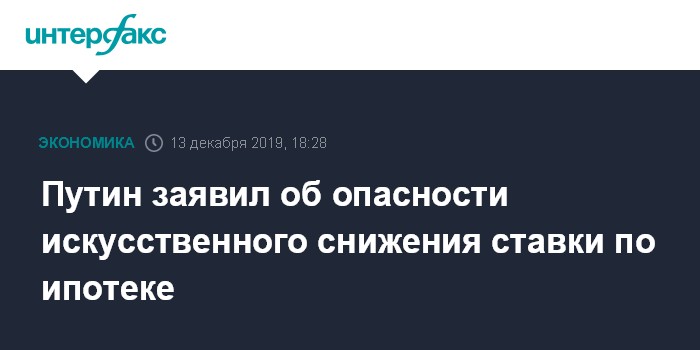 Москва. 13 декабря. INTERFAX.RU - Президент РФ Владимир Путин заявил, что над снижением ставки по ипотечным кредитам нужно работать, но опасно это делать искусственно.