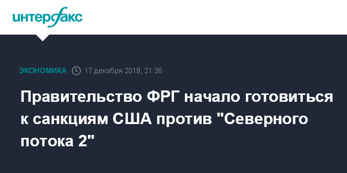 Москва. 17 декабря. INTERFAX.RU - Правительство ФРГ готовится к американским санкциям против "Северного потока 2", которые могут вступить в силу уже в пятницу. Об этом со ссылкой на секретный документ министерства экономики Германии сообщает во вторник таблоид Bild.