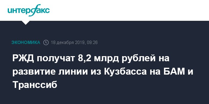 Москва. 18 декабря. INTERFAX.RU - ОАО "Российские железные дороги" получит 8,23 млрд рублей на финансирование проекта по развитию участка Междуреченск-Тайшет, обеспечивающего выход грузов из Кузбасса на Транссибирскую и Байкало-Амурские магистрали.