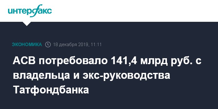 Москва. 18 декабря. INTERFAX.RU - Агентство по страхованию вкладов (АСВ) подало заявление о привлечении к субсидиарной ответственности по обязательствам Татфондбанка на 141,4 млрд рублей лиц, контролировавших эту кредитную организацию, говорится в пресс-релизе госкорпорации.