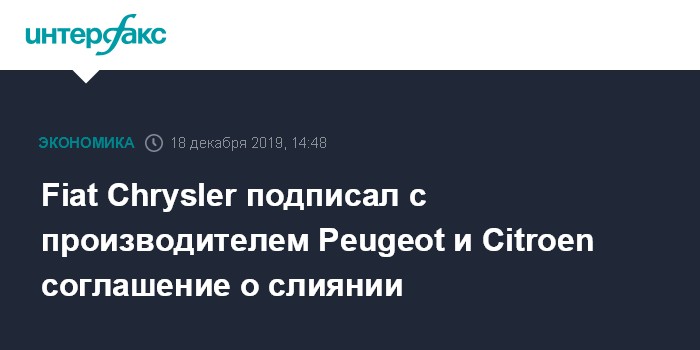 Москва. 18 декабря. INTERFAX.RU - PSA Group (выпускает автомобили Peugeot и Citroen, а также DS, Opel и Vauxhall) с Fiat Chrysler Automobiles NV (FCA) договорились о слиянии в рамках сделки, которая создаст четвертого по величине автопроизводителя в мире.