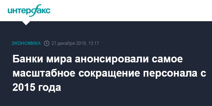 Москва. 27 декабря. INTERFAX.RU - Банки по всему миру объявляют о планах сокращения рабочих мест, которое может стать самым масштабным за последние четыре года, урезая расходы на фоне замедления роста мировой экономики и перехода на цифровые технологии, пишет в пятницу Bloomberg.