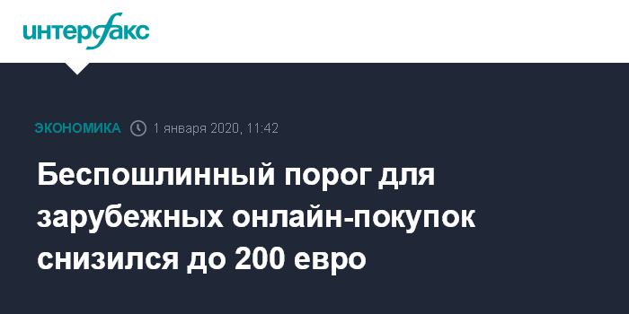 В декабре Минфин подготовил и направил на согласование в ведомства проект поручения Совета Евразийской экономической комиссии проработать предложения Москвы снизить порог беспошлинного ввоза товаров физлицами в рамках интернет-торговли до 20 евро с 2022 года Предлагается последовательно снижать порог до 100 евро за одно международное отправление с 1 июля 2020 года, до 50 евро - с 1 января 2021 года и до 20 евро - с 1 января 2022 года.
